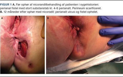 Nicorandil aktiverer kaliumkanaler med en adjuverende vasodilatorisk effekt til behandling af angina pectoris. Nicorandils hyppigste bivirkninger er rødme, takykardi, kraftløshed, hovedpine, kvalme, opkastning og rektal blødning. En association mellem perianale ulcerationer og behandling med nicorandil blev først kendt i 2002 [1]. Der er siden rapporteret om et stigende antal tilfælde, herunder orale ulcerationer, ulcerationer i vulva og på penis [2-4]. Alle beskrevne ulcerationer helede efter seponering af nicorandil.