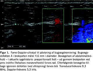 Ultralyd (UL)-skanninger, CT og MR-skanninger er velbeskrevne [2] metoder til påvisning af bugvægsdefekter. I forbindelse med UL har Valsalvas manøvre været brugt, idet man herved får en dynamisk fremstilling af hernieringen. En dokumentation og tydeliggørelse af denne dynamik ved hjælp af UL suppleret med farve-Doppler præsenteres.