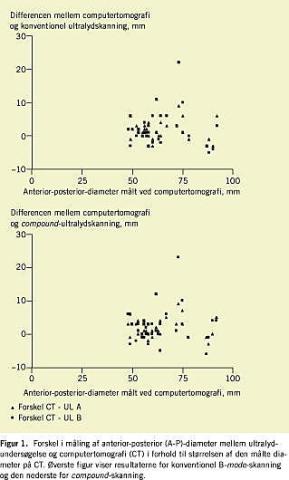 Resultater: Overensstemmelsen mellem de to UL-undersøgeres resultater var god. Der var også kun en beskeden forskel mellem CT og UL-skanning. Statistisk var der ingen forskel mellem resultaterne, hvad enten vi vurderede reproducerbarheden ved anvendelse af konventionel B- mode -skanning eller den nyere compound -skanningsmetode.