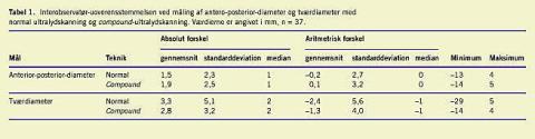Overensstemmelsen mellem de to undersøgeres vurdering af de samme UL-billeder var god (Tabel 1 ). Statistisk var der ingen forskel mellem resultaterne, hvad enten vi vurderede reproducerbarheden ved anvendelse af konventionel B-mode -skanning eller den nyere compound -skanningsmetode. Aritmetrisk differens i A-P-diameter var -0,2 mm og 0,1 mm for henholdsvis konventionel metode og compound -metode (p = 0,47). I tværdiameter var den aritmetriske differens -2,4 mm og -1,3 mm for konventionel metode og compound -metoden (p = 0,23).