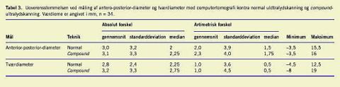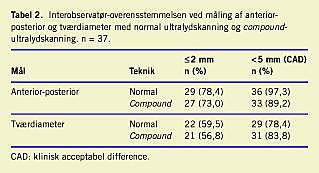 Ved måling af A-P-diameter ved konventionel UL-skanning lå 29 af resultaterne (78,4%) inden for 2 mm fra hinanden og 36 (97,3%) havde en CAD < 5 mm) (Tabel 2 ). Det var som forventet sværere at vurdere tværdiameteren, men også her var der ret god overensstemmelse mellem de to undersøgeres resultater: 22 af resultaterne (59,5%) lå inden for 2 mm fra hinanden og 29 (78,4%) mindre end 5 mm fra hinanden. Der opnåedes også god overensstemmelse med anvendelse af compound imaging : Forskellen i A-P-diameter var ≤ 2 mm i 27 tilfælde (73%) og < 5 mm i 33 tilfælde (89,2%). Tilsvarende tal for tvær-diameteren var: ≤ 2 mm: 21 (56,8%) og < 5 mm: 31 (83,8%).