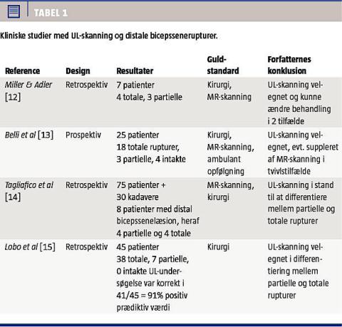Der foreligger fire engelsksprogede kliniske studier, hvor man har undersøgt brugen af UL i diagnosticeringen af distale bicepssenerupturer [12-15] (Tabel 1). To af disse studier er imidlertid med meget få patienter [13, 14], og det er derfor ikke muligt at udregne statistik. I to studier af Belli et al [12] og Lobo et al [15] indgik der hhv. 25 og 45 patienter. Studiedesignet gør det i begge tilfælde umuligt at udregne brugbar statistik for et negativt testresultat.