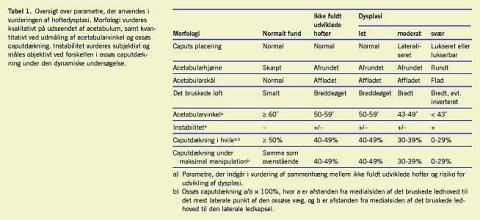 Morfologi og stabilitet blev vurderet. Morfologiske parametre vurderedes på baggrund af et koronalt standardbillede gennem den dybeste del af acetabulum. Ved instabil hofte centreredes hoften inden den morfologiske vurdering, hvilket vil sige, at en lateraliseret eller lukseret hofte reponeredes inden måling af den acetabulare vinkel. De morfologiske parametre, der blev anvendt, fremgår af Tabel 1 . Stabiliteten blev vurderet ved længde- og tværskanning i tre planer for at påvise instabilitet i tre dimensioner [2].