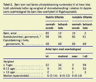 I alt 117 børn blev skinnebehandlet. Seks var blevet diagnosticeret efter 12. leveuge. Fire børn blev behandlet operativt - en var diagnosticeret direkte efter fødslen (Ehlers-Danlos' syndrom), to var diagnosticeret i 6.-12. leveuge, og en var diagnosticeret sent. Dysplasiens sværhedsgrad og tiden til normalisering af hofterne fremgår af Tabel 2. Median behandlingstid var syv (spændvidde: 2-16) uger. Sammenhængen mellem sværhedsgraden af dysplasien og tiden til ultrasonisk normalisering var statistisk signifikant (p = 0,02). Median behandlingstid for let dysplasi var seks uger, mens den for moderat og svær dysplasi var henholdsvis otte uger og ni uger.