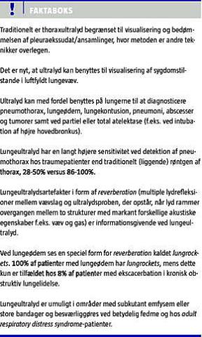 UL er allerede en velkendt billedmodalitet til at påvise og drænere pleuraansamlinger, men kan yderligere bidrage til diagnostiske informationer, der dog forudsætter et kendskab til undersøgelsesteknik og billedfortolkning ved ultralydskanning af lungerne.