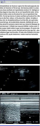 Af ovenstående fremgår det, at en stor del af de pleurapulmonale informationer, som kan opnås med UL, hidrører fra, »hvad man normalt opfatter som UL-artefakter«. Det må i den forbindelse ikke glemmes, at konventionel billeddannelse naturligvis stadig har sin berettigelse især til evaluering af lungekonsolidering og pleuraansamling. Lungekonsolidering er udtrykket for alveolens tab af luft og opfyldning med væske i stedet, som det ses ved pneumoni og atelektase, hvilket altid vil forbedre de akustiske forhold. Konsolideringerne findes gerne basalt og/eller i kontakt med thoraxvæggen, som er en betingelse for brug af UL til diagnostikken. Lungekonsolideringen ligner levervæv i udseende (Figur 2 ). Der kan indimellem ses hyperekkoiske punkter eller linjer, der gengiver luftfyldte områder i bronkier/bronkioler kaldet air bronchograms . Afhængigt af, om de bevæger sig i forhold til respirationen, kan man afgøre, om det drejer sig om ateletatisk væv eller pneumonisk væv. Tilstedeværelse af tumor, malign proces og absces kan ses direkte.