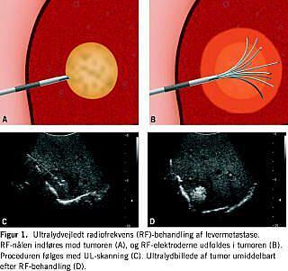 Ved hypertermisk behandling destrueres tumorvævet efter opvarmning til mere end 60 ºC. Behandlingerne udføres i universel anæstesi under UL-vejledning - enten perkutant eller intraoperativt i kombination med kirurgi. Tumorvævet opvarmes gradvis med en eller flere RF-elektroder, som anbringes UL-vejledt. I et næsten kugleformet volumen på 4-5 cm i diameter omkring elektroderne opnås cytotoksiske temperaturer. De danske erfaringer med hypertermisk behandling af levermetastaser omfatter flere former for energikilder. Nolsøe et al anvendte i 1989 NdYAG-laser. En serie på 15 patienter med nonresektable maligne levertumorer blev behandlet med mikrobølger i perioden 1995-1998. Resultaterne viste en femårsoverlevelse på 20% og 32 måneders median-overlevelse. Flere udenlandske og danske resultater [1] med RF-ablation af nonresektable, maligne levertumorer synes at bekræfte de præliminære erfaringer. I en udenlandsk opgørelse af 117 patienter med 179 levermetastaser overlevede 50% i 33 måneder, og der var en femårsoverlevelse på 22%. Der er endnu ikke gennemført randomiserede undersøgelser, og inklusionskriterierne såvel som evt. adjuverende behandling varierer betydeligt.