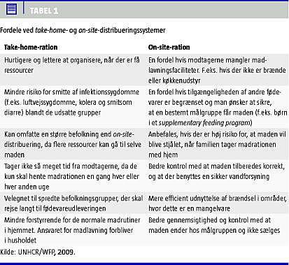 I de nævnte programmer kan maden både blive tilberedt på stedet (on-site) eller udleveret som take-home -rationer. FN-organisationerne anbefaler, at take-home -rationer overvejes først, bl.a. fordi omkostningerne er lavere (Tabel 1 ). Det er oftest personer med lokal autoritet, der står for uddelingen [5], men pga. f.eks. korruption og videresalg er der risiko for, at maden ikke når dem, der har behov.