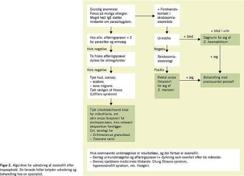 Fra Hospital for Tropical Diseases, London, opnåede man hos 261 patienter med eosinofili (her defineret som > 500 eosinofile leukocytter/mikroliter) dog at finde en indvoldsorm (helmint) hos 64%, heraf fik 80% stillet diagnosen efter første besøgs screeningsprøver. Blandt de screeningsprøver, som blev anvendt i London, var foruden skistosomiasisserologi og de øvrige prøver nævnt i Figur 1 også Strongyloides - og filariasisserologi [27].
