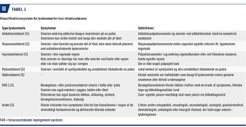 Den kliniske undersøgelse baseres på en overordnet klassificeringsmodel, som er etableret på baggrund af et konsensusmøde mellem førende eksperter på området fra hele verden [5]. Her inddeles de forskellige og mest sandsynlige problemer i specifikke kliniske enheder på baggrund af forskellige smerteprovokationstest (Tabel 1). Disse provokationstest er baseret på standardiserede og reliable palpationstest og isometriske modstandstest [7, 14]. Man klassificerer lyskesmerterne i fire overordnede kliniske enheder, nemlig adduktor-, pubis-, ingvinal- og iliopsoasrelaterede smerter [5]. Genkendelig smerte hos idrætsudøveren i forbindelse med palpation af specifikke anatomiske strukturer anvendes til at definere den specifikke kliniske enhed [5, 7, 14]. Sportsbrok er en betegnelse, der fejlagtigt anvendes om patienter med ingvinalrelaterede lyskesmerter. Der er imidlertid ikke tale om et reelt brok, men oftest om en overbelastningstilstand eller læsion i ingvinalkanalens bagvæg. Den hyppigste skade er dog smerter i adduktorer og os pubis.