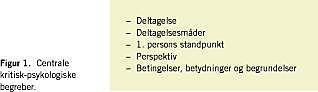 Teoretisk tilgang var kritisk psykologi [5, 6]. Centralt er, at menneskers deltagelse i samfundslivet ikke lader sig forstå løsrevet fra de sammenhænge og den praksis, mennesker indgår i. Forskningsmetoden er som følge heraf praksisforskning, der gør op med en abstrakt forståelse af menneskers handlen til fordel for den forståelse, at menneskelige fænomener må studeres i konkrete situationer og sociale sammenhænge [7, 8]. Praksisforskningen adskiller sig fra andre analyseretninger ved at forene empiri og teori. Undervejs i interviewene og analysen udvikledes den teoretiske forståelse for de unges fællesskaber og rygningens betydning. Der var tale om en vekselvirkning, hvor det empiriske materiale informerede teorien, og hvor teorien informerede det empiriske materiale [7]. Som led i denne dialektiske proces blev bestemte kritisk psykologiske begreber relevante og centrale [5-8], Figur 1 . Derudover var en analyse af sundhedsbegreberne central for undersøgelsens konklusioner. For at indfange kompleksiteten og det mangfoldige i efterskolelivet blev det tilstræbt at indfange dilemmaer, modsætninger og prioriteringer i deltagelses- og handlemåder.