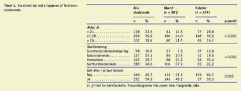 I alt blev 548 spørgeskemaer udfyldt (svarprocent: 92,3). Undersøgelsen blev gennemført på alle fakulteter og på alle SDU's campusser (i Odense, Kolding, Esbjerg og Sønderborg). En stratificeret stikprøvemetode blev brugt, og der blev taget hensyn til fordelingen af studerende på de forskellige fakulteter og de fire campusser. Gennemsnitsalderen blandt respondenterne var 23,7 år med en standardafvigelse på 6,3 år (spændvidde: 18-67 år). Tabel 1 viser karaktertræk ved respondenterne opdelt efter køn. De kvindelige studerende var generelt yngre, flere var fra sundheds- og samfundsvidenskab, og flere var gift eller i fast forhold, end mandlige studerende var.