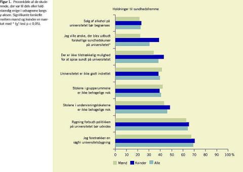 Størstedelen af de studerende (69,8%) havde en positiv holdning til en røgfri universitetsbygning og en stram rygepolitik (Figur 2 ). 40-50% af de studerende fandt, at stolene i undervisningslokaler og grupperum var ubehagelige. Omkring 40% var ikke tilfredse med indretningen af universitetet, og næsten samme andel var utilfreds med udbuddet af sund mad. En tredjedel af de studerende ville gerne have udbudt forskellige sundhedskurser (med emner som f.eks. stresshåndtering, rygestop eller ryggymnastik) på universitetet, mens kun en femtedel havde en positiv holdning til en begrænsning af salget af alkohol på universitetet. Kvinder var mere interesserede i sundhedskurser end mænd (p < 0,001), mens der ingen kønsforskel var i forhold til de øvrige forhold.