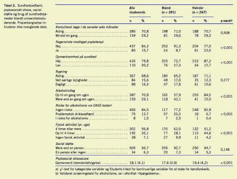 Materiale og metoder: I en tværsnitsundersøgelse blev studerende på Syddansk Universitet (n = 548, svarprocent 92,3) udspurgt ved brug af et standardiseret, selvadministreret spørgeskema med spørgsmål vedrørende demografiske forhold, opmærksomhed på sundhed, brug af sundhedsservices, sundhedsadfærd, velvære på universitetet samt interesse i sundhedsfremmende programmer og politik herom.