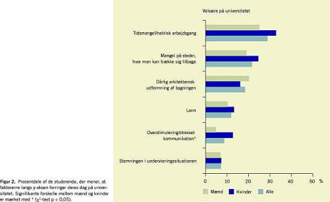 Figur 1 viser procentdelen af studerende, som føler, at deres velvære bliver hæmmet af forhold ved studiet eller på campus. Tidsmangel/hektisk arbejdsgang og mangel på steder, som man kan trække sig tilbage til, blev rapporteret som værende de hyppigste problemer blandt studerende. 29% af de studerende syntes, at tidsmangel var et problem, mens kun 7% fandt, at stemningen i undervisningssituationen forringede deres dag. Kvindelige studerende følte sig signifikant mere påvirket af informationsoverstimulering og stresset kommunikation (p < 0,014), mens der ikke sås nogle kønsforskelle ved de øvrige faktorer.
