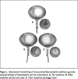 Injektionen blev udført i universel anæstesi eller i spinal-analgesi. Macroplastikken blev injiceret med en specialkonstrueret pistol via et cystoskop. Der blev injiceret 2-4 depoter submukøst ca. 1/2 cm distalt for blærehalsen i en mængde, så depoterne næsten lukkede blærehalsen (Figur 1 ). Hos over 90% blev injektionerne foretaget af den samme læge. Ved utilstrækkelig effekt ved tremånederskontrollen blev kvinderne tilbudt reinjektion.