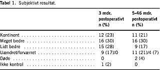 Ved den kliniske kontrol 3 mdr. efter injektionen var 12 (23%) kontinente, og 31 (58%) angav bedret kontinens (Tabel 1 ). Femten kvinder (28%) fik foretaget re-injektion efter 4-11 mdr.