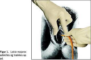 Hos kvinder adskilles labia majores og meatus urethrae afvaskes forfra bagtil (Figur 1 ).