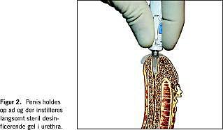 (Figur 2 ). Der anbefales klorhexidinholdig gel. Virkningen indtræder efter få min og er maksimal efter 10 min. Gelen kan indeholde lokalbedøvelse. Virkningstiden for dette er mindst 10 min. Hos mænd skal der mindst anvendes 10 ml gel. -