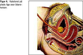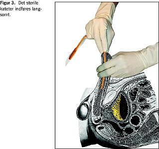 Det sterile kateter indføres langsomt (Figur 3 ). Hos mænd tilstræber man at indføre kateteret sådan, at det peger nedad i meatus mod frenulum, hvorved man undgår folden i fossa navicularis. Det føres langsomt frem, indtil man når m. sphincter urethrae. Det er en tværstribet muskel, der hurtigt afslappes. Penis føres nedad mellem benene, samtidig med at man trykker let på kateteret og afleder patienten. Når muskelmodstanden ophører, føres kateteret vi-dere ind i blæren, og urin løber ud og det indføres yderligere få centimeter. Ballonen fyldes med sterilt vand med et volumen, som angivet på kateteret. Almindeligvis 5-10 ml. En overfyldt ballon vil medføre risiko for, at drænagekanalen afklemmes, og blæren irriteres mere end nødvendigt (ballonen fyldes med sterilt vand, fordi saltvand og klorhexidin kan udfælde krystaller, som kan tilstoppe ballonkanalen. Vandværksvand kan give algevækst og luft kan sive ud). Ballonen trækkes forsigtigt ned til blærehalsen. Kateteret tilsluttes kateterposen. Man skal huske at trække præputiet her over glans penis. Hos kvinder indføres kateteret langsomt. Når urinen løber ud indføres kateteret yderligere nogle få centimeter, ballonen fyldes og trækkes forsigtig ned mod blærehalsen, og kateteret kan tilsluttes kateterposen (Figur 4 ).