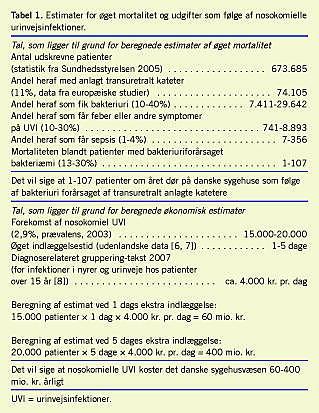 Skulle man foretage forsigtige beregninger af den øgede mortalitet og de øgede økonomiske udgifter, som er forårsaget af nosokomielle UVI, er man i mangel af bedre nødt til at benytte en del usikre tal og data, bl.a. fra udenlandske studier. En beregning af den øgede mortalitet viser at 1-107 patienter årligt dør på danske sygehuse som følge af bakteriuri forårsaget af et transuretralt anlagt kateter (Tabel 1 ). En beregning af de øgede udgifter som følge af nosokomielle UVI viser, at nosokomielle UVI koster det danske sygehusvæsen 60-400 mio. kr. årligt (Tabel 1). Herudover vil der også være øgede udgifter til f.eks. medicin og bleer/uridomer, hvilket ikke er undersøgt nærmere.