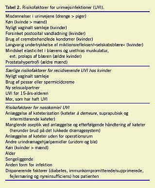 Køn og alder er også risikofaktorer ved nosokomiel UVI. Patienter med anden form for infektion, patienter med diabetes, immunkompromitterede eller immunsupprimerede patienter, nyreinsufficiente patienter og fejlernærede vil ligeledes have øget risiko for nosokomiel UVI (Tabel 2 ).