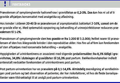 Summary Urological problems in pregnancy, birth, and puerperium - a systematic review Ugeskr Læger 2012;174(18):1225-1229 Urological problems in pregnancy represent a diagnostic and therapeutic challenge. Urinary tract symptoms in pregnant women comprise urinary tract infections, urolithiasis, hydronephrosis, urinary retention, urinary frequency and urinary incontinence. The primary purpose of this paper was to link our current understanding of the urinary tract anatomy and physiology to urinary tract symptoms in pregnancy and puerperium and the secondary purpose was to provide a review on diagnosis and management of these.