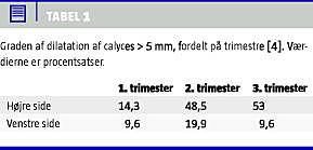 Som det fremgår af Tabel 1, er hydronefrose (calyces majores > 5 mm) et hyppigt fund hos gravide, specielt i andet og tredje trimester [4]. Præ-valensen af symptomgivende hydronefrose i graviditeten er 0,2-3% [5, 6]. Lændesmerter forekommer hos tre ud af fire gravide med symptomgivende hydronefrose ensidigt på højre side, hvilket afspejler graden af dilatation af urinvejene som en vigtig faktor. Analgetika (paracetamol og i andet trimester evt. nonsteroide antiinflammatoriske stoffer) og aflastning af kvinden i sideleje på den ikkesymptomgivende side afhjælper symptomerne, men reducerer ikke nødvendigvis graden af nyrebækkendilatation, hos mere end ni ud af ti kvinder med symptomgivende hydrofrose [5]. Aflastning af det afficerede nyrebækken med et dobbelt J-kateter medfører smerter hos en fjerdedel af de gravide, og denne behandling forbeholdes derfor kvinder, som ikke responderer på konservativ behandling, og kvinder med urosepsis [6]. Som alternativ til et dobbelt J-kateter kan man overveje anlæggelse af nefrostomi. Hydronefrose kan undtagelsesvist medføre nyrebækkenruptur, hvilket er en ofte fredelig komplikation, der normalt kan behandles konservativt.