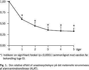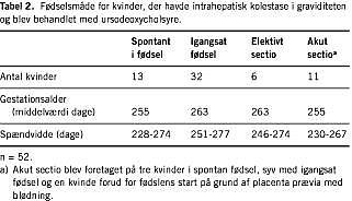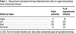 Resultater: Tooghalvtreds kvinder (42 enkeltgraviditeter, ni tvillinge- og en trillingegraviditet) blev behandlet med ursodeoxycholsyre. Behandlingen varede i 27 dage (middelværdi, spændvidde 1-104). Den gennemsnitlige behandlingsvarighed til symptomlindring var syv dage. 92% af kvinderne oplevede symptomlindring i en eller anden grad. Af kvinder, der blev behandlet i mere end en uge, havde alle på nær en et fald i ALAT. Middelgestationsalderen ved fødslen var 260 dage (spændvidde 230-277 dage). Apgar score efter 1, 5 og 10 min var 9,3 ± 0,2 (middelværdi ± standard error of mean (SEM), spændvidde 4-10), 9,8 ± 0,1 og 10 ± 0. Navlesnors-pH var 7,32 ± 0,008 (middelværdi ± SEM). Den perinatale mortalitet var 0, og den perinatale morbiditet var udelukkende korreleret til præmaturitet. Den eneste registrerede bivirkning var en let diaré, der optrådte hos tre kvinder. Der blev ikke registreret bivirkninger hos børnene.