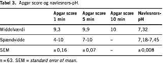 Middelværdi for fødselsvægt var 3.042 g (spændvidde 1.566-4.225 g). Ingen børn blev fundet small for gestational age. Hos 39 var der klart fostervand, ti havde grønt fostervand som tegn på intrauterin stress, hos tre var det uoplyst. I Tabel 3 vises data for alle 63 børn.