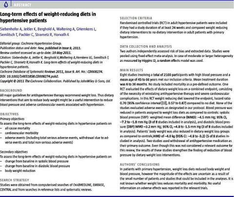 <li>Siebenhofer A, Jeitler K, Berghold A et al. Long-term effects of weight-reducing diets in hypertensive patients. Cochrane Database Syst Rev 2011;(9):CD008274.</li>