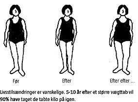 Det er vanskeligt at undersøge effekter af et vægttab over længere tid (> 5-10 år), da et tilsigtet, kostinduceret vægttab ofte er efterfulgt af vægtøgning. Vægtøgningen kommer ikke nødvendigvis de første år, men efter 5-10 år har ca. 90% taget de tabte kilo på igen [6, 7]. Mange tager endnu hurtigere de tabte kilo på igen, og dette fænomen, hvor vægttab efterfølges af vægtstigning, kaldes for weight cycling. De fleste undersøgelser af dette viser, at personer, der har haft denne udvikling, har en større risiko for at dø end overvægtige, der har stabil vægt [8].