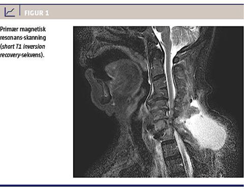 Tre uger efter udskrivelsen blev patienten indlagt akut på intensivafdeling pga. septisk shock forudgået af tre dages hoste og seks dages smerter i armene. Han var øm i nakken ved palpation. Paraklinisk fandt man svært forhøjet C-reaktivt protein-niveau, og der blev igangsat bredspektret antibiotisk behandling. En akut MR-skanning viste en 8 × 4 × 9 cm stor absces i forbindelse med det tidligere operationsfelt, og der blev foretaget operativ fjernelse. Den næste uge forværredes patientens tilstand, og der udvikledes pareser. En fornyet MR-skanning fire dage senere viste svær infektion, der var beliggende i den paravertebrale muskulatur og strakte sig ind til karskederne. Ved en computertomografi (CT) påviste man luft omkring den ventraltliggende skinne. Mikrobiologisk svar fra dyrkning af abscesmaterialet 14 dage efter indlæggelsen viste vækst af Veillonella parvula (VP) (findes normalt i svælgflora/gastrointestinalkanalen), der var fuldt følsomme for det givne antibiotikum, og mistanken om øsofagusperforation blev rejst. Gennemgang af tidligere røntgenoptagelser af thorax viste, at der manglede en af fire skruer i osteosyntesematerialet. Den formodede øsofagusperforation blev bekræftet ved CT med indhældning af kontrast. Man afstod primært fra øsofagoskopi, da man mente, at der var for store risici. Mhp. oprensning og dekompression af rygmarven blev patienten atter opereret med fjernelse af osteosyntesemateriale og udførelse af laminektomi i niveau C6. To uger senere foretog man stabiliserende operation med nyt osteosyntesemateriale. Øsofagusperforationen blev konservativt behandlet. Patienten blev udskrevet fra