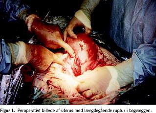 Efter laparatomi fandt man et stort intraperitonalt hæmatom på 2.000 ml med koagler uden umiddelbar identificerbar blødningskilde. Man udførte sectio i nederste uterussegment, hvor man fandt klart fostervand, og der blev født en levende dreng på 2350 g med en Apgarscore på 2/1, 10/4. Placenta løsnede sig spontant og blev vurderet som hel uden tegn på abruptio. Efter udtømmelse af hæmatomet identificerede man en stor 7-8 cm længdegående ruptur i bagvæggen af uterus lidt til venstre for midtlinjen (Figur 1). Rupturen blev sutureret med krydssuturer med efterfølgende god hæmostase. Den øvrige del af uterus fandtes normal uden tegn på misdannelser. Drengen blev umiddelbart intuberet, men igen ekstuberet efter et par minutter. Siden blev han overflyttet til neonatalafdeling og forsatte med continuous positive airway pressure (CPAP)-behandling i otte dage. Han blev udskrevet i velbefindende og god trivsel efter 41 dages indlæggelse pga. den initiale CPAP-behandling og langvarig icterus. Kvinden fik to blodtransfusioner efter fødslen, men rettede sig hurtigt og blev udskrevet velbefindende en uge senere.