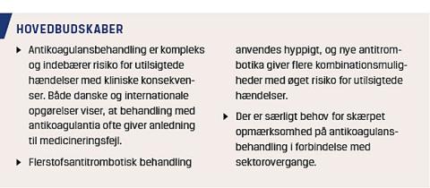 Behandling med orale antikoagulantia resulterer i mange alvorlige UTH. Udviklingen af NOAK har gjort håndteringen af AK-behandling betydeligt simplere, men de nye farmaka har samtidig forøget kombinationsmulighederne inden for antitrombotika. Antallet af rapporterede UTH med antikoagulantia er fortsat højt, både for VKA og NOAK. Der er derfor behov for skærpet opmærksomhed på AK-behandling og lokale tiltag med det sigte at reducere forekomsten af utilsigtede hændelser, f.eks. tjeklister, og i særdeleshed øget fokus på håndtering ved invasive procedurer og sektorovergange.