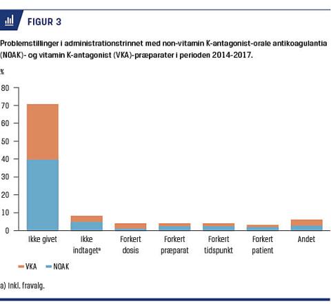 og 28% af UTH med VKA og NOAK) skete i forbindelse med administration (udlevering eller indtagelse) (Figur 2), og den hyppigste fejl (71%) var, at præpatatet ikke blev givet (Figur 3). Af de resterende hændelser indtraf 31% (22% for VKA og 9% for NOAK) i forbindelse med dispensering (dosering eller optælling), og 13% (9,0% for VKA og 4% for NOAK) i forbindelse med ordination (f.eks. manglende ordination eller fejldosering), mens de resterende 4% af hændelserne blev kategoriseret under andre trin i medicineringsprocessen (Figur 2).
