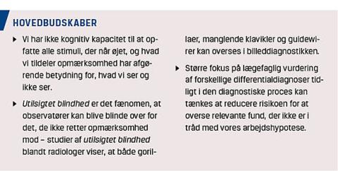 Denne artikel handler om, hvordan der i en radiologs perception af et billede kan opstå en blindhed over for det, der ikke tildeles opmærksomhed – en bias kendt som utilsigtet blindhed. Desuden diskuteres faldgruber, der kan medføre, at vores opmærksomhed drages væk fra relevante fund. F.eks. kan kliniske fund og en tentativ diagnose, der er anført i journalen, føre til manglende opmærksomhed på alternative diagnoser, så fund, der understøtter andre diagnoser, risikerer at blive overset. Det diskuteres endvidere, om den opmærksomhed, der i klinikerens hverdag rettes mod et kompliceret it-system, risikerer at kompromittere den opmærksomhed, der er tilovers til det kliniske overblik.