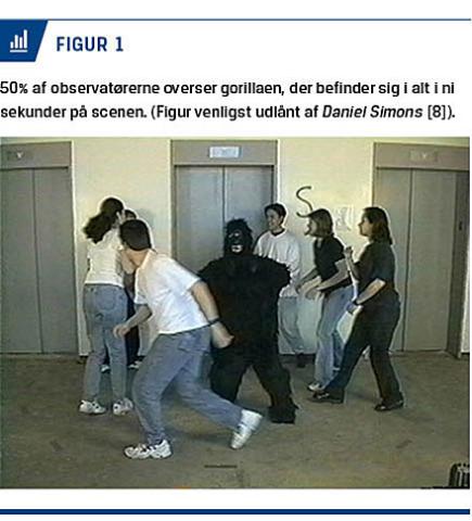 At vores fokus er af afgørende betydning for, hvad vi ser og ikke ser, beskrives i en lang række studier, hvoraf det mest markante er studiet af the invisible gorilla [8]. Her iagttager en gruppe observatører en video, hvor henholdsvis sort- og hvidklædte personer kaster bolde imellem sig. Observatørerne skal tælle, hvor mange gange dem i hvidt tøj afleverer en bold til hinanden.