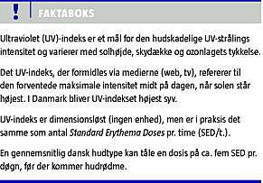 Det UV-indeks, der formidles både internationalt og nationalt, er et mål for den forventede maksimale intensitet af solens hudskadelige ultraviolette (UV) stråling midt på dagen, når solen står højest på himlen [1, 2]. UV-indekset beregnes og måles af Danmarks Meteorologiske Institut (DMI) [3], og det formidles til befolkningen bl.a. i vejrudsigterne i TV (DR1 og TV2). Det angives, at beskyttelse mod solens UV-stråling er tilrådelig, når UV-indekset er større end tre. En god tommelfingerregel, der gælder i Danmark, er, at UV-indeks er større end tre, når din skygge er kortere, end du er høj, altså når solhøjden er større end 45 grader. I Danmark svinger UV-indekset mellem nul og syv hen over året, mens det ved ækvator kan blive op til 15. I højtliggende bjergområder, der er dækket af sne og is, som Himalaya og Andes, kan indekset blive op mod 20.