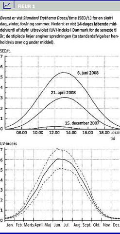 Figur 1 viser fordelingen af SED pr. time for en dag med skyfrit vejr vinter, forår og sommer. I de tre timer med kraftigst sol midt på dagen vil der være næsten samme antal SED pr. time. I april vil der være ca. 9 SED og i juni-juli ca. 18 SED i dette tidsrum. For at begrænse eksponeringen anbefales det [5], at man søger skygge i de tre timer (kl. 12-15 dansk sommertid), hvor ca. halvdelen af dagens erytemdosis falder. Før klokken 12 falder altså ca. 25% af dagens erytemdosis, og ca. 25% falder efter klokken 15. Såfremt man er ude hele dagen, vil man sidst i april, med et typisk UV-indeks på 3-4, maksimalt kunne udsættes for ca. 18 SED, mens man i juni/juli, med et typisk UV-indeks på 5-6, maksimalt kan blive udsat for ca. 36 SED.