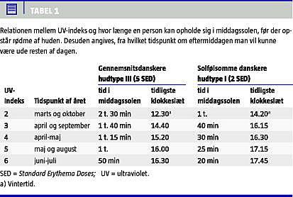 Da gennemsnitsdanskerens hud om foråret tåler ca. 4 SED (1-8) pr. dag og om sommeren ca. 5-6 SED (1-10), før huden bliver rød, er det let at se, at man vil blive skoldet selv med et UV-indeks på tre, hvis man er ude hele dagen (dagsdosis 18 SED). Her kommer den relativt lave forårstemperatur naturligvis til hjælp, idet den begrænser lysten til at tage tøjet af, og desuden vil de fleste ikke have samme hudområde vendt mod solen hele tiden. Men man vil kunne blive rød i løbet af blot halvanden time midt på dagen i april, og solbeskyttelse bør nok anbefales allerede ved et UV-indeks på to, hvor der vil være ca. 12 SED i løbet af dagen, når det er skyfrit (Tabel 1 ). Ekstremt UV-følsomme personer vil blive røde af en dosis på blot en SED, men i Danmark vil meget følsomme kunne tåle ca. to SED [6].