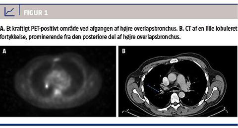 En 60-årig mand blev indlagt med henblik på operation for nasalpolypper. Han havde ingen symptomer fra lunger eller luftveje trods rygning svarende til 50 pakkeår. Røntgenundersøgelse af thorax og lungefunktionsmåling viste normale forhold. I forbindelse med et videnskabeligt projekt blev der med patientens accept foretaget bronkoskopi. I højre overlaps andet segment fandt man en lille tumor af typen planocellulært karcinom. PET-CT viste et 0,8 cm stort metabolisk aktivt område, som strakte sig ind i lumen med klassifikation T1aN0M0 (Figur 1). Præoperativ rebronkoskopi afslørede imidlertid, at tumoren faktisk involverede både første og andet segment samt hovedbronchus, altså T2a i stedet for T1a. Konsekvensen var, at man i stedet for en torakoskopisk lobektomi valgte åben muskelbesparende torakotomi med lobektomi og sleeve resection, hvor lappen blev fjernet sammen med den involverede del af højre hovedbronchus. Efterfølgende blev der foretaget en anastomose mellem højre hovedbronchus og højre intermediærbronchus. Der blev ligeledes foretaget systematisk lymfeknudedissektion uden fund af lymfeknudemetastaser. Den endelige TNM-klassifikation var således T2aN0M0, stadie Ib. Patienten havde efter to år ikke fået recidiv, men en benign stenose krævede gentagne ballondilatationer.