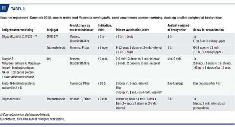 Neisseria meningiditis is a cause of sepsis and meningitis. Based on the capsule, six groups are recognised to cause invasive disease: A, B, C, W135, X and Y. In Denmark, five vaccines are marketed to protect against five of the six groups. One conjugated glycoprotein vaccine against serogroup C alone: MenC, two conjugated vaccines against ACWY: ACWY-TT/ACWY-CRM, and two protein-based vaccines against serogroup B: 4CMenB and MenB-fHbp. Overall, the efficacy is good, but the persistence of immunity is decreasing over time, why a booster is recommended for long-term protection.