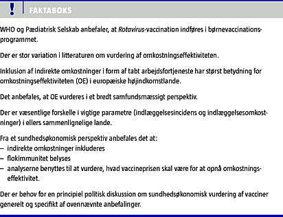 Indførelse af en ny vaccine i børnevaccinationsprogrammet er en politisk beslutning, og det er også en politisk beslutning, i hvilket perspektiv man ønsker at betragte OE. Ud over at undgå indlæggelser af lidt over 1.000 børn om året er den væsentligste bevæggrund for at forebygge RV-infektion at aflaste udearbejdende forældre og undgå, at samfundet og familien selv lider overlast på grund af reducerede arbejdsmuligheder. Dette synes især at være væsentligt i en dansk kontekst, hvor det er almindeligt, at begge forældre er på arbejdsmarkedet. Sundhedsøkonomer vil generelt anbefale, at der benyttes et bredt samfundsperspektiv, hvor det er muligt [19], og et review af kliniske retningslinjer [20] viser, at man i lande, som vi normalt sammenligner os med (Norge, Sverige og Finland), anbefaler anvendelse af samfundsperspektivet i deres sundhedsøkonomiske analyser. Specielt i relation til evaluering af vacciner anbefales det, at der bruges et samfundsperspektiv. Der findes ikke nogen fasttømret dansk praksis på området. F.eks. er vaccination mod pneumokokker indført baseret på en klinisk anbefaling og en vurdering af en norsk sundhedsøkonomisk analyse, der viste, at vaccination ikke var OE i et sundhedsperspektiv (pris for 1 QALY > 90.000 euro), men omkostningsbesparende i et samfundsperspektiv. Humant papillomvirus-vaccination blev indført på basis af en MTV, hvor den sundhedsøkonomiske analyse viste, at det var OE i et sundhedsperspektiv. I begge tilfælde ses det, at inklusion af flokimunitet gør vaccination mere OE.