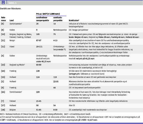 En søgning i PubMed i december 2010 blev foretaget med nøgleordene rotavirus, vaccine og costs . Forfatterne identificerede uafhængigt af hinanden de studier, der viste sig at være reelle OE-analyser af RV-vaccination i et europæisk højindkomstland. Studierne blev inkluderet ved konsensus. I Tabel 1 gives et overblik over studierne. Nedenfor nævnes de væsentligste forskelle i resultaterne.