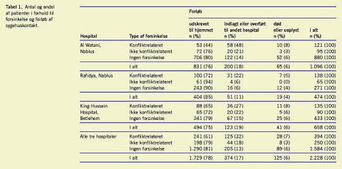 Det er påpeget, at det er en alvorlig udfordring for folkesundheden, at der mangler data om de sundhedsmæssige konsekvenser af voldelige konflikter [2]. WHO anbefaler dataindsamling på skadestuer som et redskab til at vurdere sundhedskonsekvenserne af en væbnet konflikt [3]. Vi udnyttede erfaringerne fra registreringen af skadestuekontakter i det danske Landspatientregister og gennemførte en systematisk indsamling af data om skadestuekontakter på tre sygehuse i Vestbredden, bl.a. med henblik på at analysere omfanget af begrænsninger i patienternes adgang til sygehuse og de mulige konsekvenser heraf.