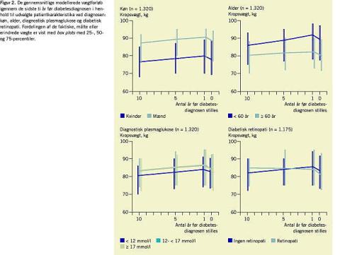 Formålet var at beskrive vægthistorien for 1.320 personer med nyopdaget type 2-diabetes i relation til patientkarakteristika ved diagnosetidspunktet. Den mediane selvrapporterede vægtøgning fra 20-årsalderen til diagnosen, hvor den mediane alder var 65,3 år, var 14,7 kg. Den gennemsnitlige vægtøgning fra 10 år før diagnosen til diagnosetidspunktet var imidlertid kun 1 kg og varierede med bl.a. alder, køn, diagnostisk plasmaglukose og forekomsten af diabetisk retinopati. Disse resultater bidrager til at basere praktiserende lægers vægtrådgivning på evidens.