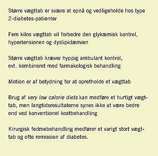 I denne oversigt diskuteres effekten af vægttab, specielt på den glykæmiske kontrol, og kardiovaskulære risikofaktorer, herunder hvad der er et realistisk vægttab at opnå hos hovedparten af patienterne. Endvidere vil effekten af farmakologisk og kirurgisk behandling på overvægten hos type 2-diabetes-patienten blive omtalt.