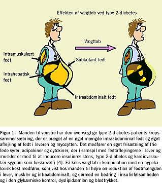 Type 2-diabetes er en livsstilssygdom, der opstår, når genetisk disponerede personer bliver overvægtige og fysisk inaktive. Hos de fleste type 2-diabetes-patienter er der da også en direkte sammenhæng mellem graden af glykæmisk kontrol og vægtændringer, og blot et par kilos ændring i vægten kan registreres på den glykæmiske kontrol [1-3]. Vægttab hos type 2-diabetes-patienten øger insulinfølsomheden og reducerer leverens glukoseproduktion; derved falder blodglukoseniveauet (Figur 1 ) [1]. Samtidig forbedres den diabetiske dyslipidæmi, og blodtrykket falder [3]. Den mest rationelle behandling er derfor livsstilsændringer med henblik på at opnå vægttab og øge den fysiske aktivitet [1-3].