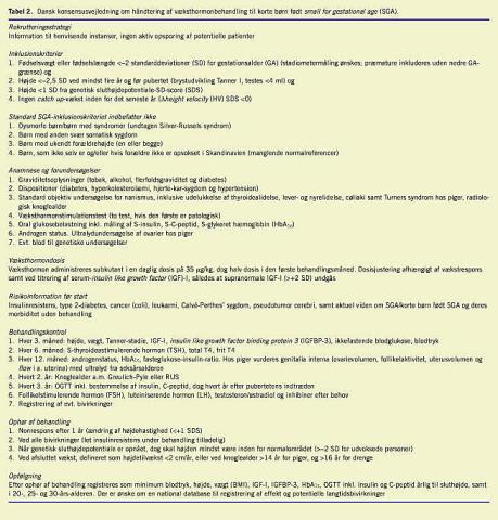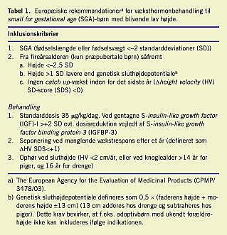 Væksthormonbehandling af børn, som er korte som følge af væksthormonmangel, Turners syndrom og kronisk nyreinsufficiens, har vist gavnlig effekt på sluthøjden og er et veletablerede behandlingstilbud. Væksthormonbehandling af andre korte børn (som f.eks. børn med familiær nanismus) har ikke haft tilstrækkelig dokumenteret effekt med de hidtil anvendte doser. Imidlertid er det nu påvist, at højden - og ikke mindst sluthøjden - kan øges signifikant hos en undergruppe af andre korte børn, nemlig børn som er født small for gestational age (SGA) [1-9]. Disse undersøgelser førte i 2003 til, at man i EU godkendte »korte børn født SGA« som en ny indikation for væksthormonbehandling (Tabel 1 ), såfremt de efter fireårsalderen fortsat har en højde på < -2,5 standarddeviationer (SD) (korrigeret for alder og køn), ikke har catch up -højdevækst, og ligger mere end 1 SD under forældrenes højdepotentiale.